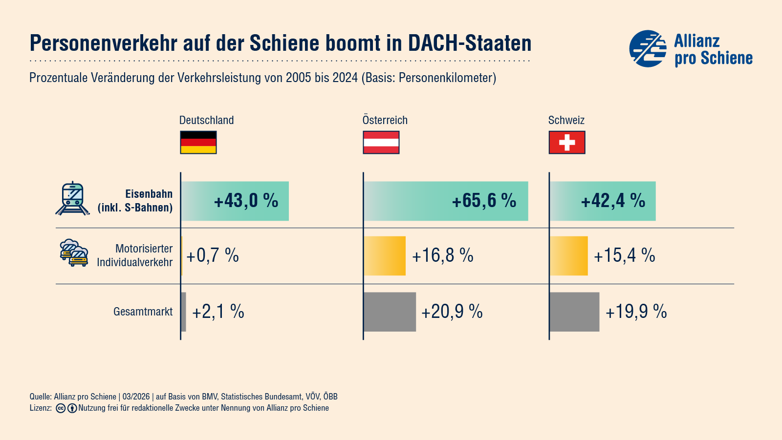 Ähnliche Veränderungen lassen sich auch in den Nachbarländern Schweiz und Österreich erkennen, wobei die Verkehrsleistung im Personenverkehr in der Schweiz von 2005 bis 2024 noch schneller gewachsen ist, nämlich um ganze 65,6 %.